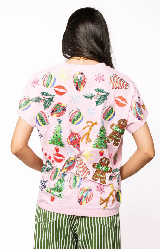 This light pink tee brings festive cheer with sparkling sequin Christmas icons that shine bright. Soft and comfortable, it’s perfect for adding a playful sparkle to your holiday outfit while keeping things cozy. Celebrate the season in style with this glittering, fun-to-wear tee!