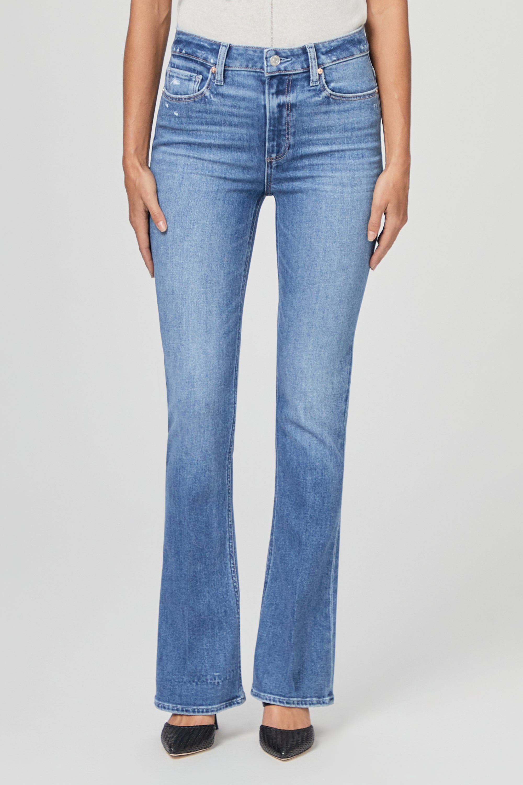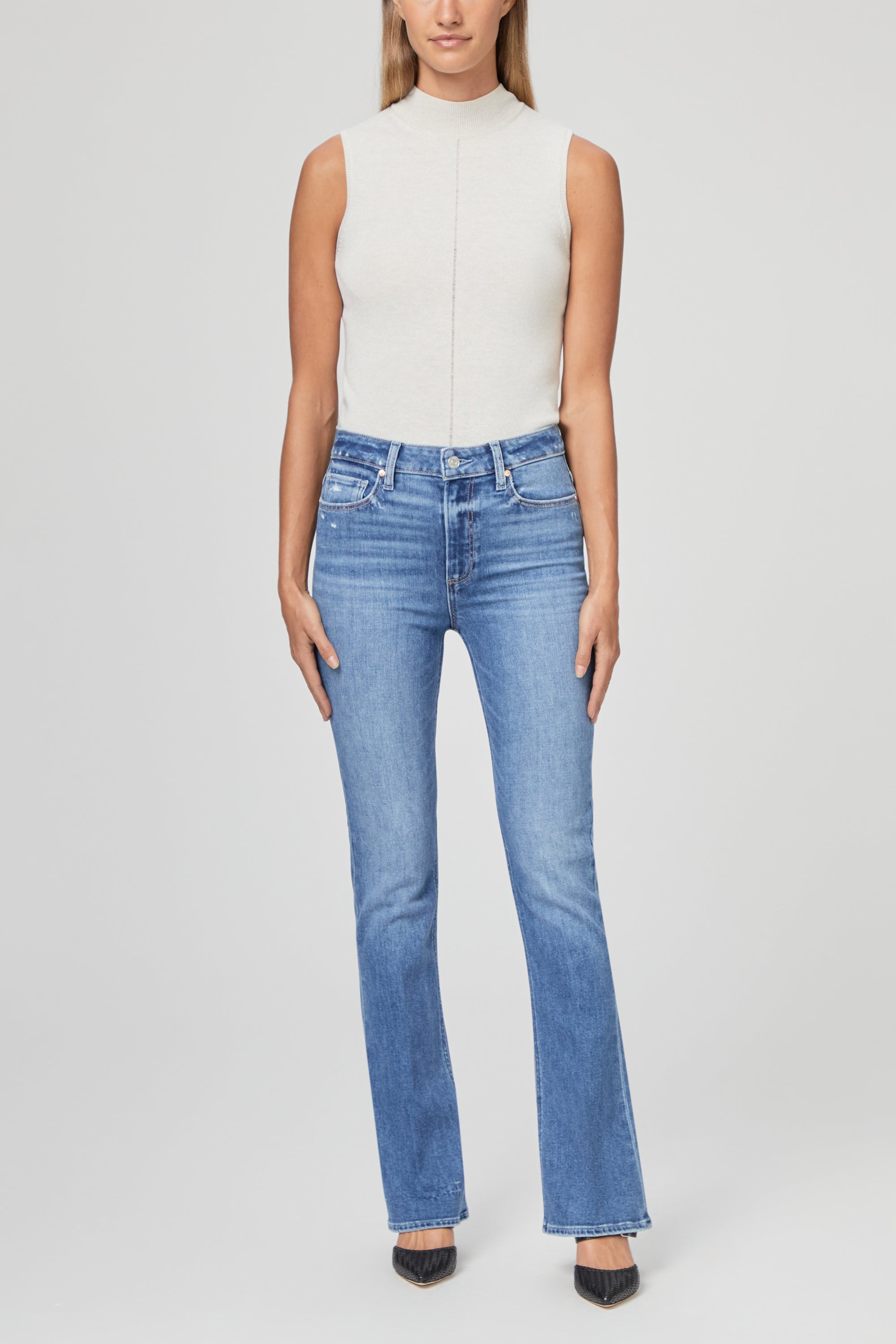 Our High Rise Laurel Canyon Petite is specifically tailored for petite women who are 5'4" and under. The High Rise Laurel Canyon is a vintage PAIGE style that feels fresh and of-the-moment. This high-rise flare comes in a lived-in, medium blue wash with whiskering, fading, and mixed metal hardware. Cut from our TRANSCEND VINTAGE denim, this style has the look of authentic vintage denim but is incredibly comfortable with plenty of stretch and recovery.