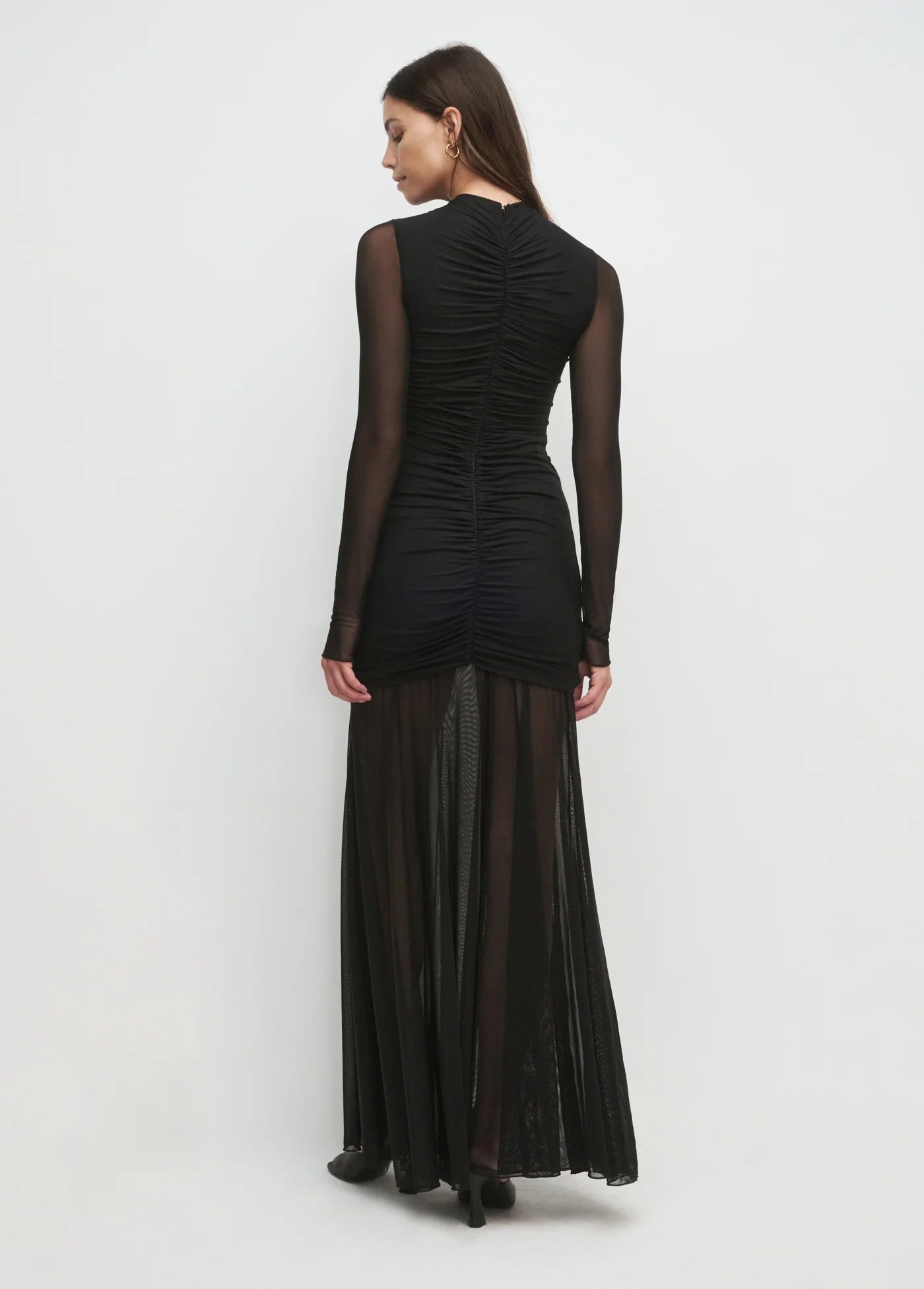 When compliments are your favorite love language. The top layer fits close with ruching front and back, a mock neckline and long sleeves. But it's the mesh underlayer with a 60" full skirt that makes it love at first sight.