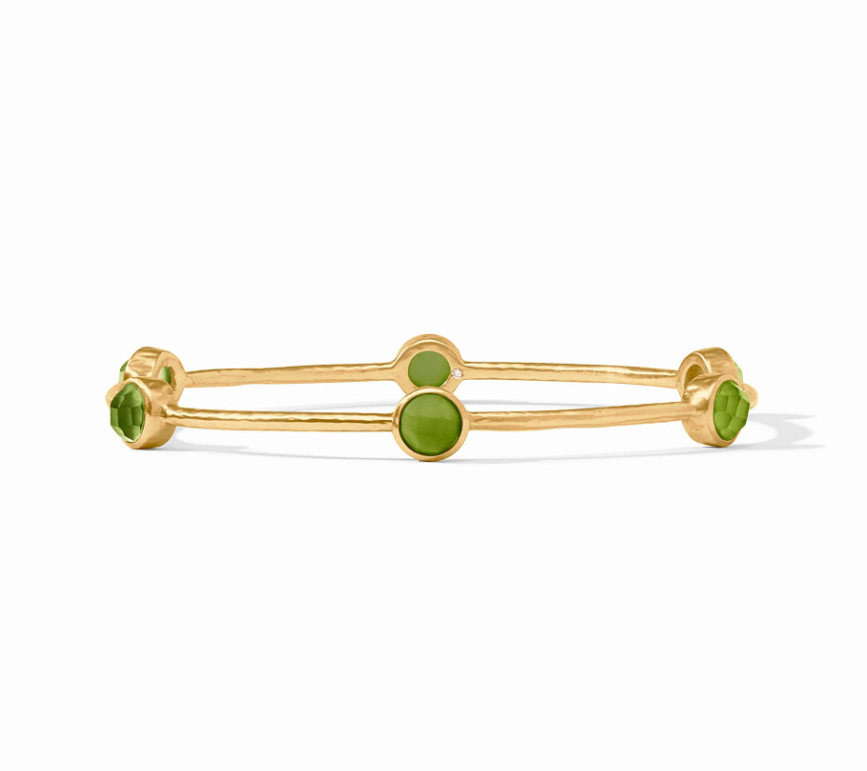A lightly hammered bangle embellished with six iridescent gemstones stations.