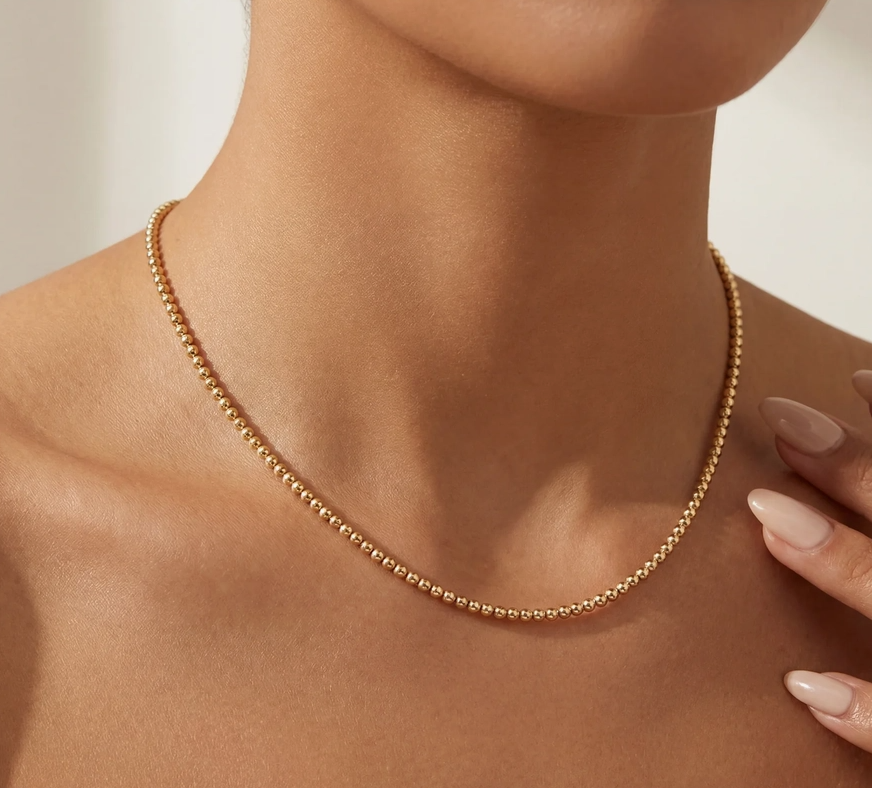 Worn like a signature. The Classic 3mm Beaded Necklace is polished enough to wear on its own and effortless to stack with your everyday favorites. • Crafted with radiant 3mm beads, this piece brings a minimalist feel to your neck while still holding its own in a layered look. • Available in several metal finishes.
