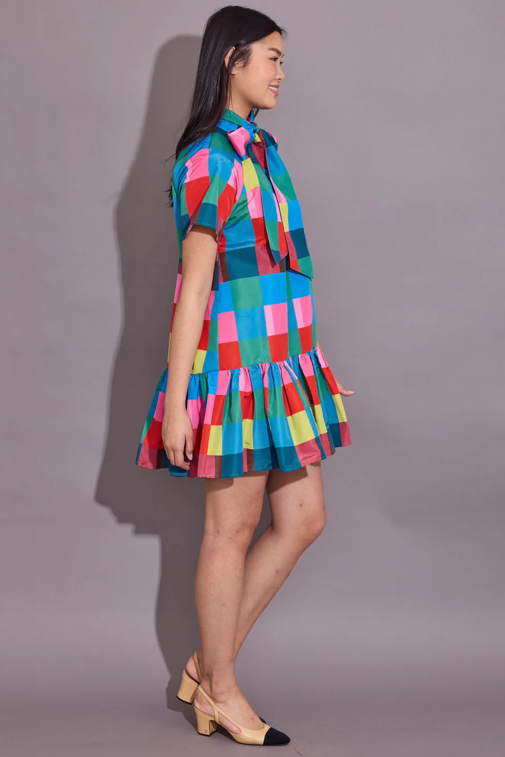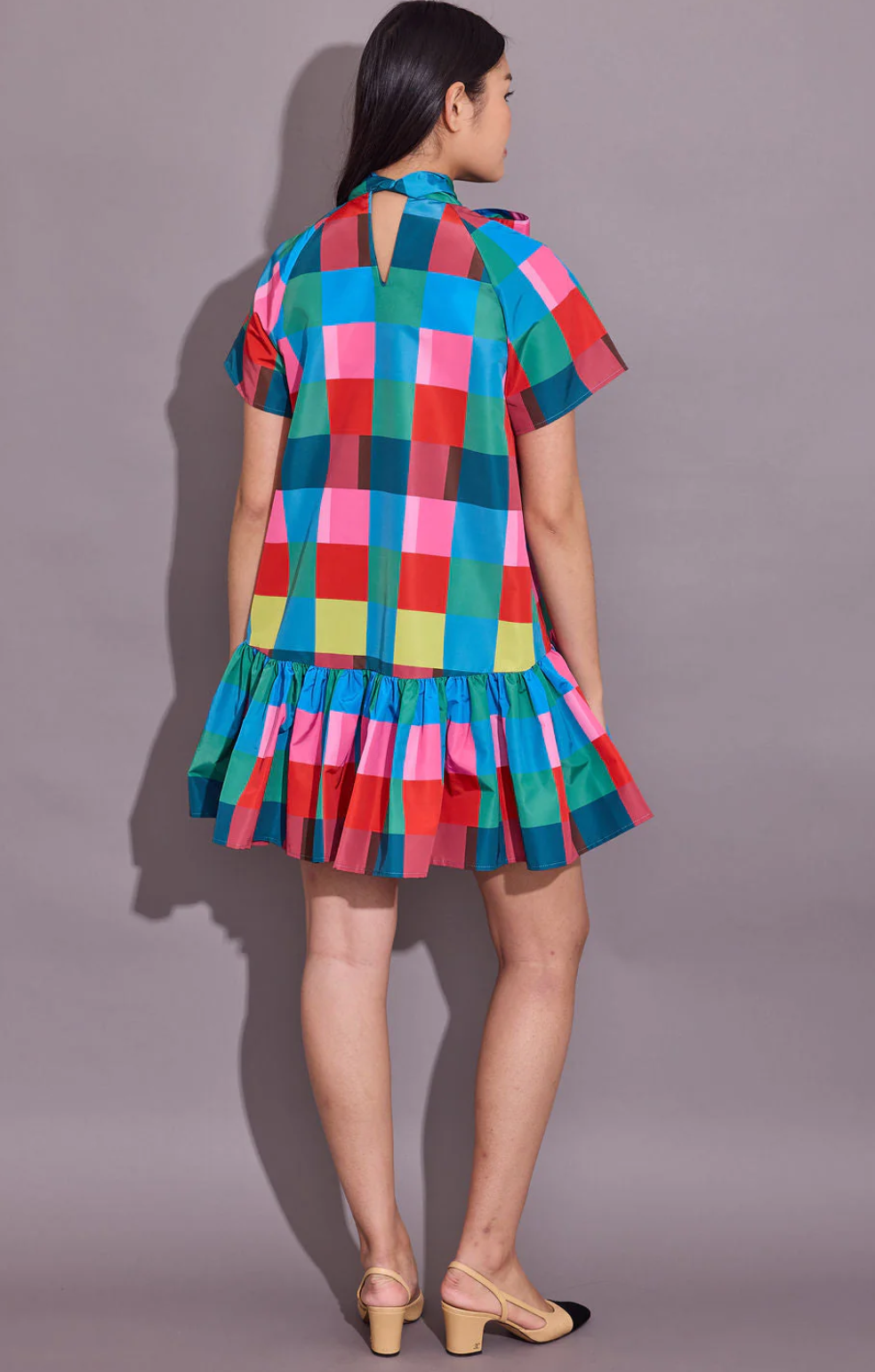 The Willa Dress in the print toile is a playful yet polished statement piece, featuring a bold checkered pattern and a flirty tiered mini skirt. Its short sleeves and high neckline add a touch of elegance to this modern, feminine silhouette.