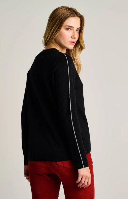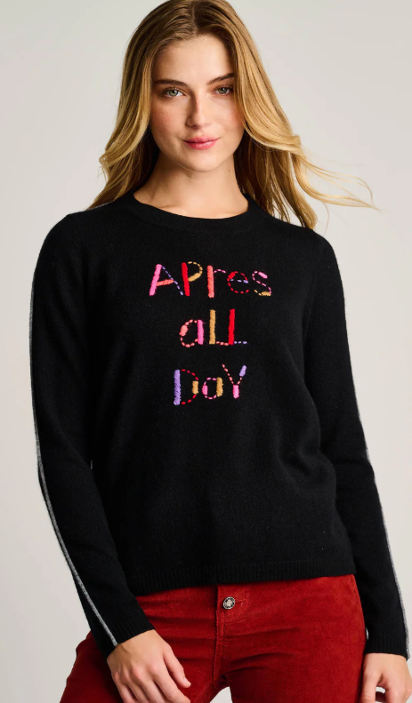 Your après-ski essential in pure cashmere. With contrast embroidery spelling “Après All Day,” bold sleeve piping, and an easy relaxed fit, this pullover sweater brings playful luxury to everything from mountain weekends to city strolls.
