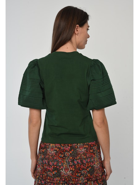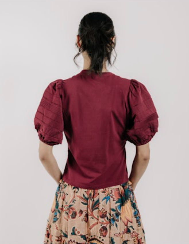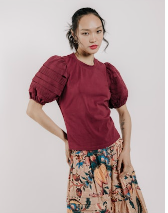 The Dylan Top brings a bold twist to the everyday tee with sculptural pintuck puff sleeves and a vibrant hue.